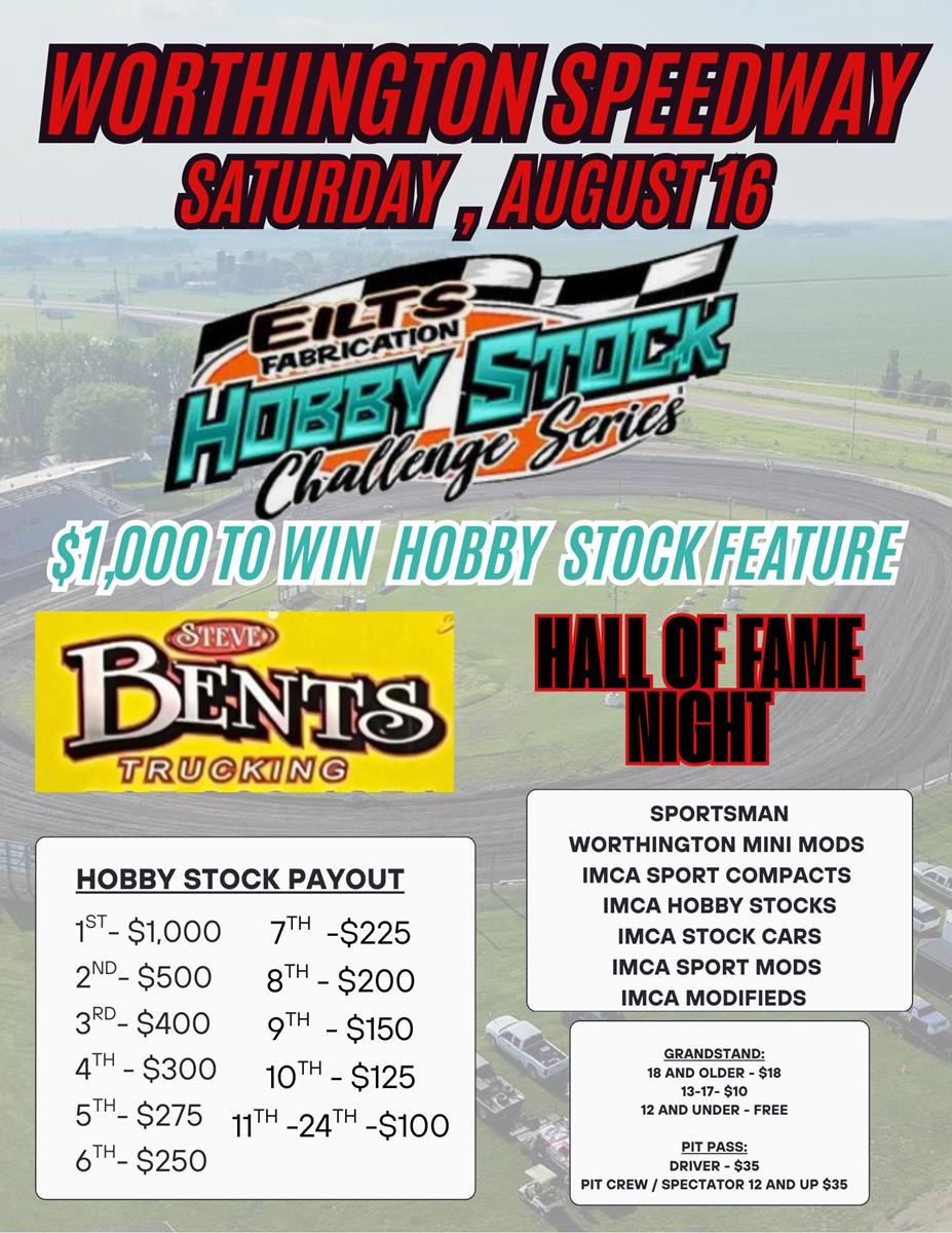 We have an action-packed night of racing with the $1,000 to win Hobby Stock Summer Challenge. All of our normal weekly classes will be running, which include the sportsman, Worthington Mini Mods, IMCA Sport Compacts, IMCA Northern Sport Mods, IMCA Stock Cars, IMCA Modifieds, and the Hobby Stock Special. It is also a very special night for two very deserving drivers, Steve Bents and Jesse Drost, as they get inducted into the Worthington Hall of Fame. Please help us celebrate the achievement of these two drivers, and watch some great racing! See you there !!